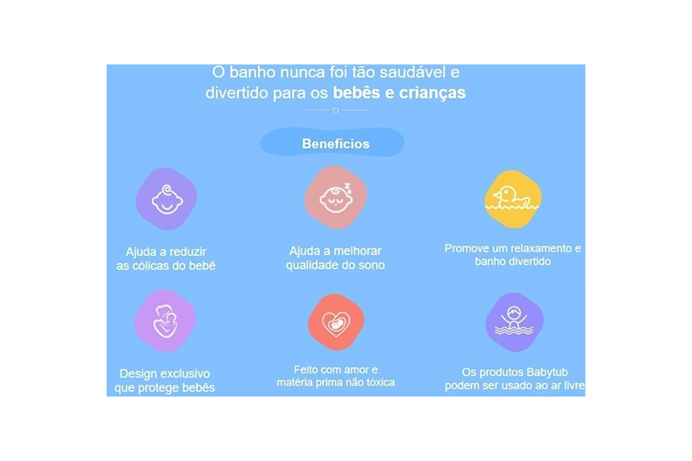 O design exclusivo do BabyTub Evolution não só oferece um banho seguro, mas também auxilia no alívio de cólicas, melhora o sono do bebê e proporciona um formato especial para cuidar delicadamente da coluna do seu pequeno.