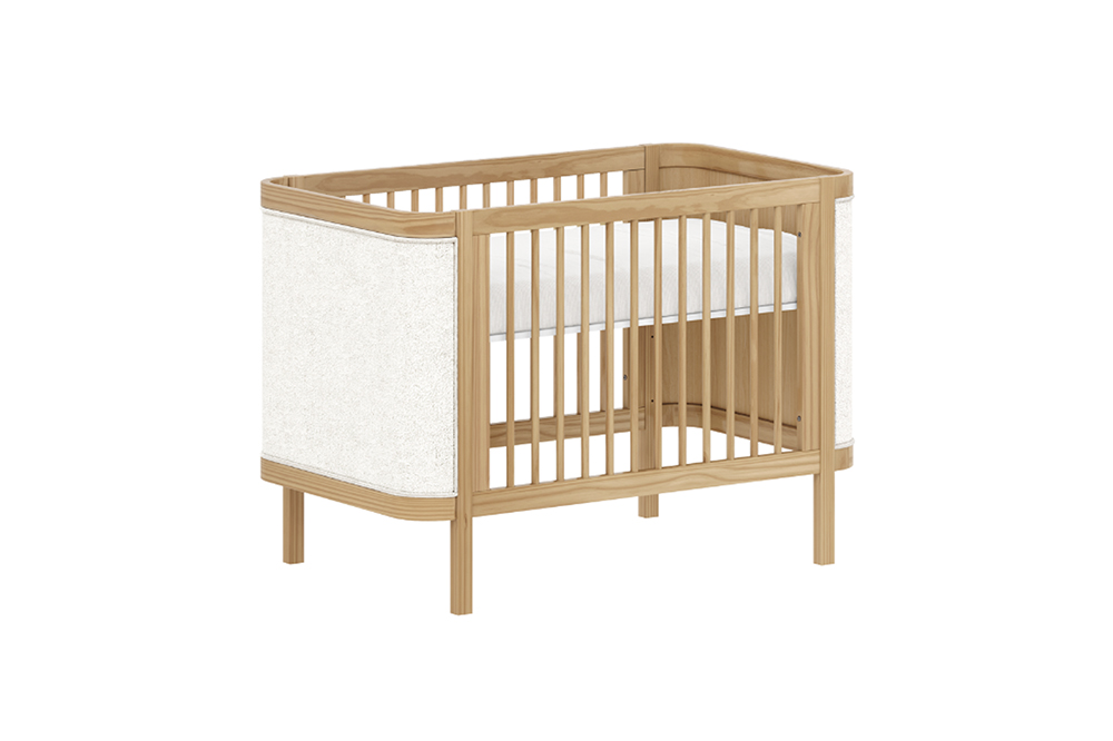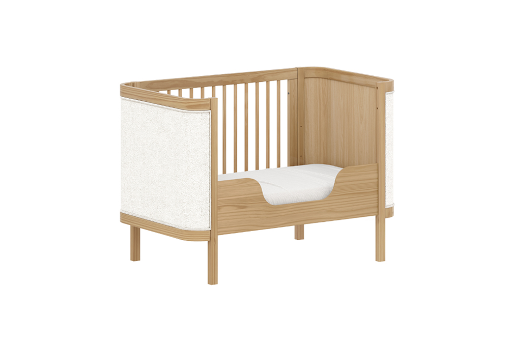 Berço 2 em 1 em madeira com tecido Bouclé na cabeceira e peseira. Se transforma em mini cama e já acompanha a barra para transformação em mini cama.