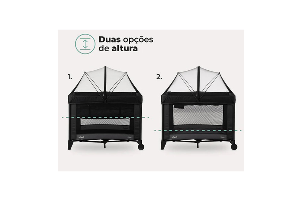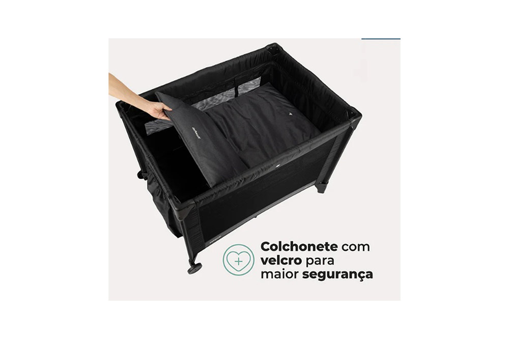 O mosquiteiro com arcos, elevado, deixa o berço mais arejado e fica posicionado longe do bebê, muito mais seguro, é fácil de instalar e sua abertura com zíper permite o acesso à criança, sempre que necessário, sem precisar remover, com muito mais praticidade. O colchonete possui zíper e trava, impedindo que ele se movimente, sendo super seguro, dando tranquilidade aos pais.