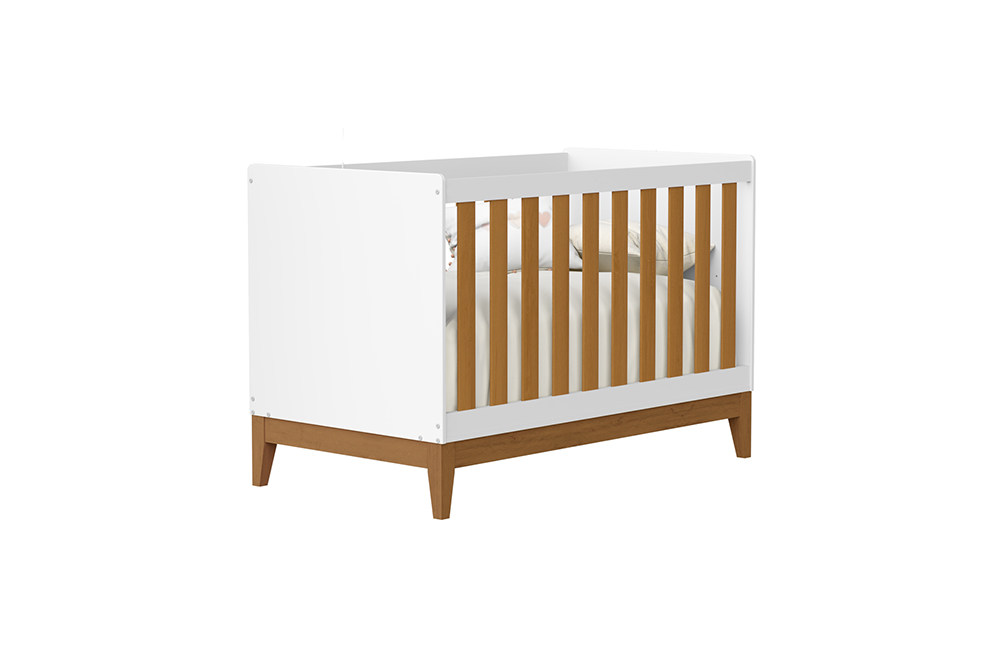 Berço padrão americano com grade fixa, 100% MDF, regulagem no estrado e pés em madeira. Se transforma em mini cama para usar até os 4 anos.