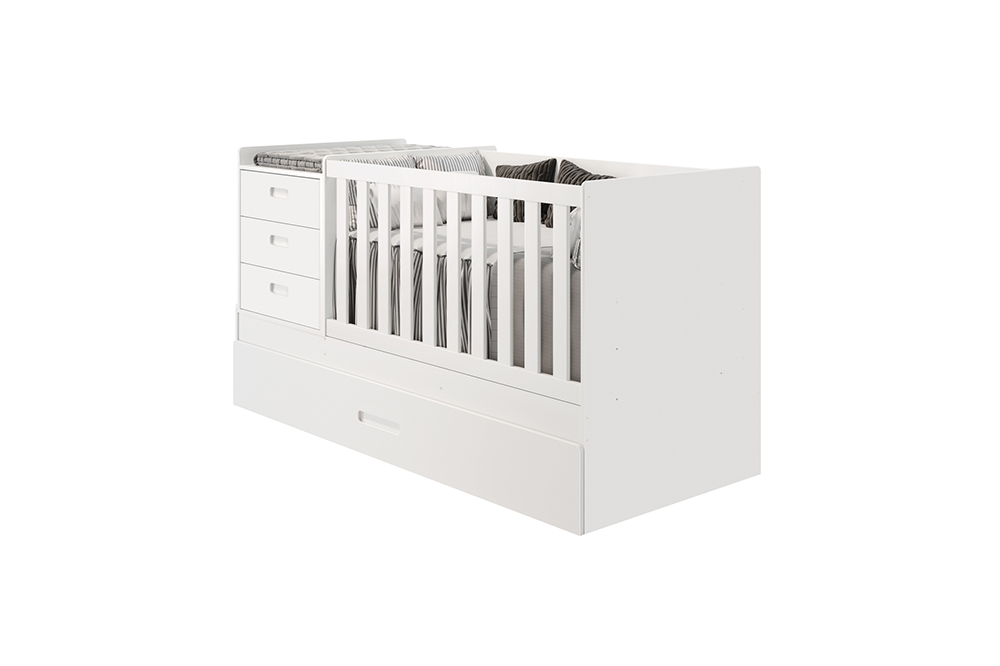 Berço Muntifuncional que se transforma em cama de solteiro, cômoda e escrivaninha.
