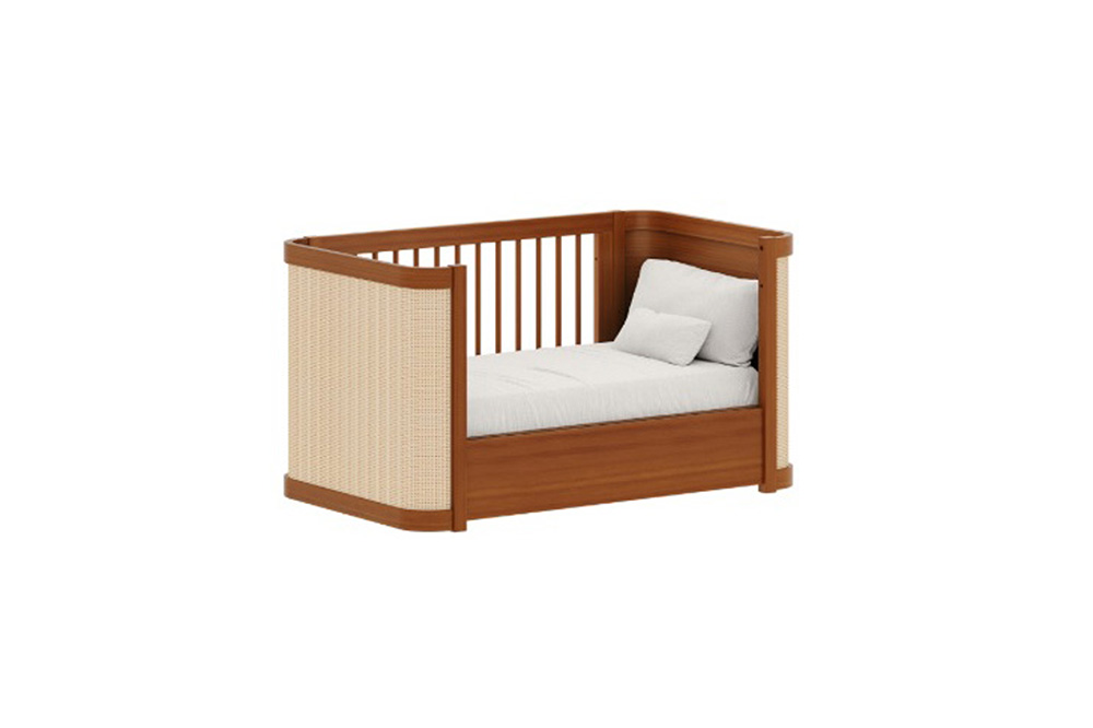 - Um lindo berço em madeira com detalhes nas cabeceiras de uma tela de Rattan.