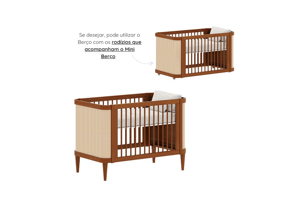 Com a opção do berço 2 em 1, é possível montar a versão do berço e posteriormente transformar em mini cama.