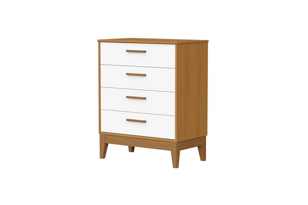 Cômoda com 4 gavetas, 100% MDF e pés em madeira.
