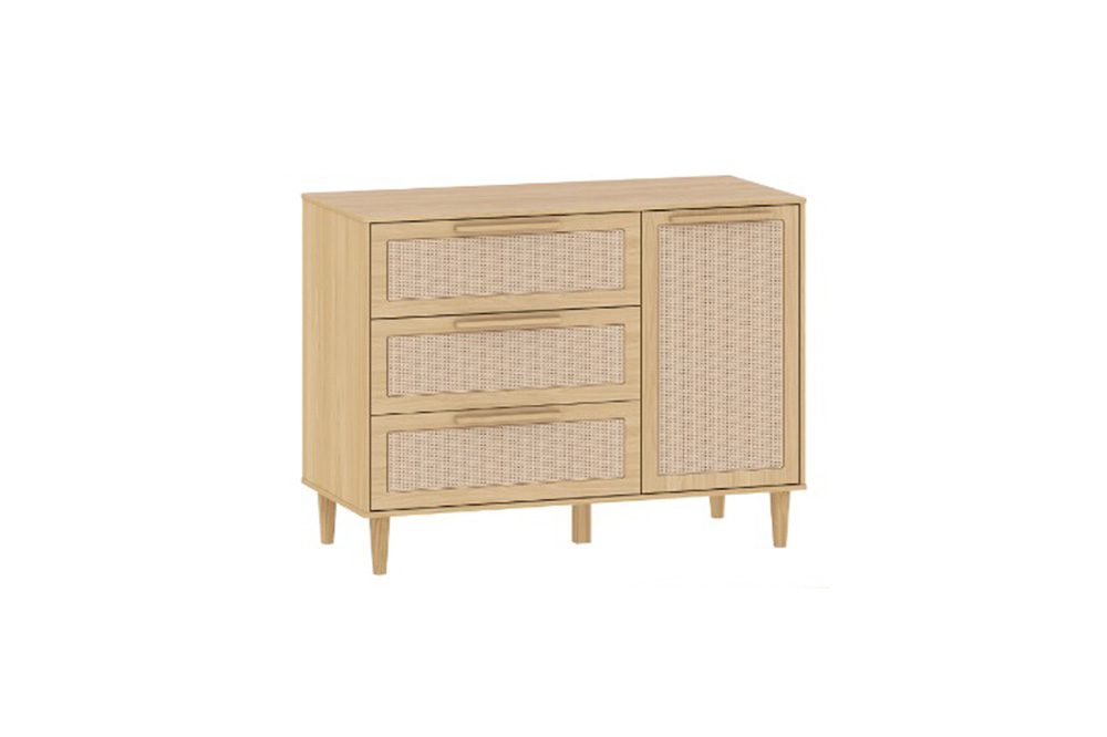 A cômoda é 100% MDF, produto de alta qualidade e durabilidade. As 3 gavetas da cômoda possuem detalhes de tela de Rattan, para deixar tudo muito mais delicado e harmonioso.