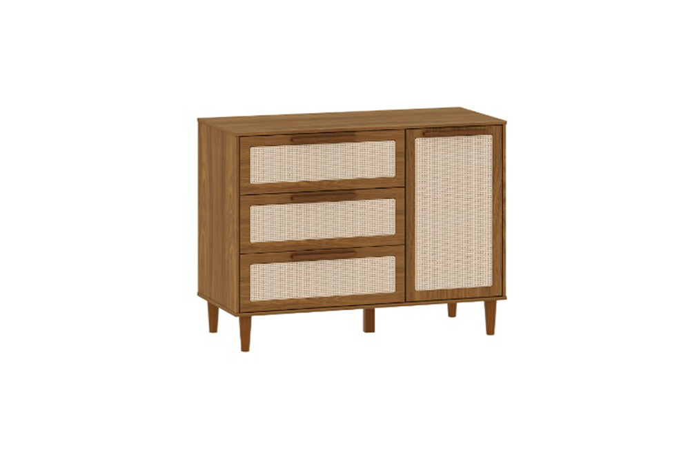 A cômoda é 100% MDF, produto de alta qualidade e durabilidade. As 3 gavetas da cômoda possuem detalhes de tela de Rattan, para deixar tudo muito mais delicado e harmonioso.