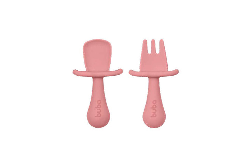 o Kit talheres silicone da Buba possui um garfo e uma colher supermacios e com design anatômico. perfeitos para as gengivas delicadas do bebê. Vem com protetor para impedir que a criança introduza profundamente o talher na boca. ideal para a autoalimentação.