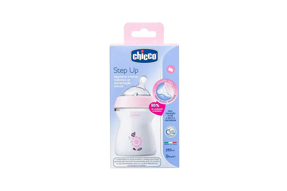 A mamadeira Step Up Chicco acompanha o crescimento do bebê, graças ao bico evolutivo. A Step Up é a única mamadeira que se adapta perfeitamente à forma individual de sucção dos bebês em cada fase de vida, os bicos possuem base extra larga, que imitam o seio materno, proporcionando uma sucção mais parecida com a natural. Ainda possui um inovador bico inclinado com válvula anti-cólica, que posiciona perfeitamente o pescoço do bebê para mamar, além de permanecer sempre cheio de leite, prevenindo o risco de ingestão exagerada de ar durante a mamada, motivo causador de cólicas, soluços e refluxos.