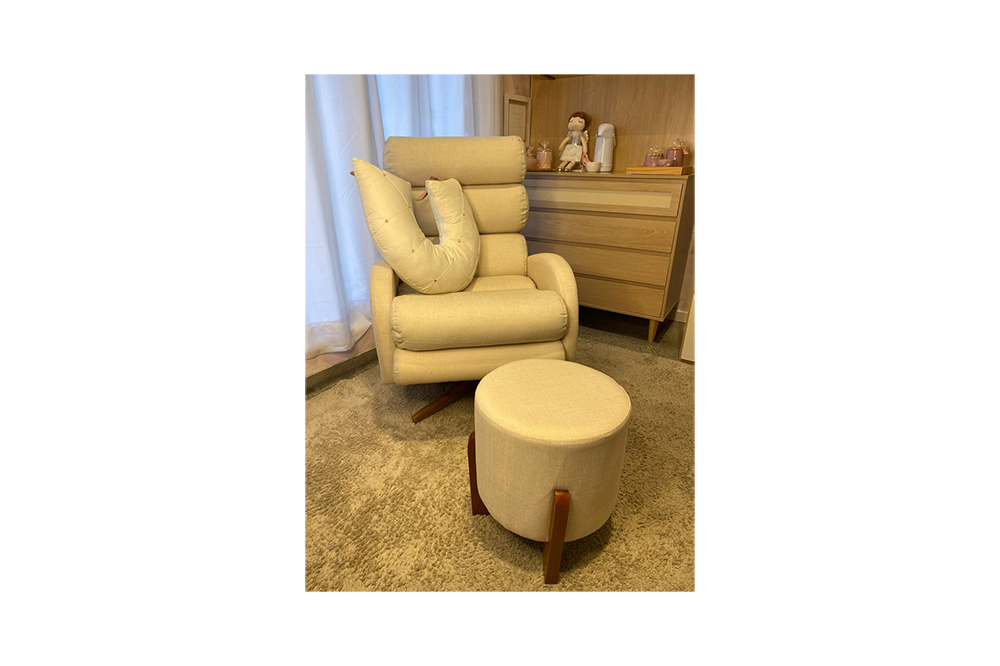Feita com matéria-prima de alta qualidade, a poltrona possui estofado revestido por tecido de toque suave que proporciona aconchego para os momentos de amamentação.
