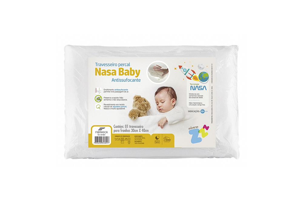 O travesseiro Nasa Baby Fibrasca é produzido com enchimento em viscoelástico (Nasa) que se molda aos contornos da cabeça do bebê, trazendo maciez e conforto na hora de dormir. Para maior segurança, esse travesseiro possui orifícios em sua estrutura que evitam o sufocamento dos bebês ao virarem de bruços durante o sono.